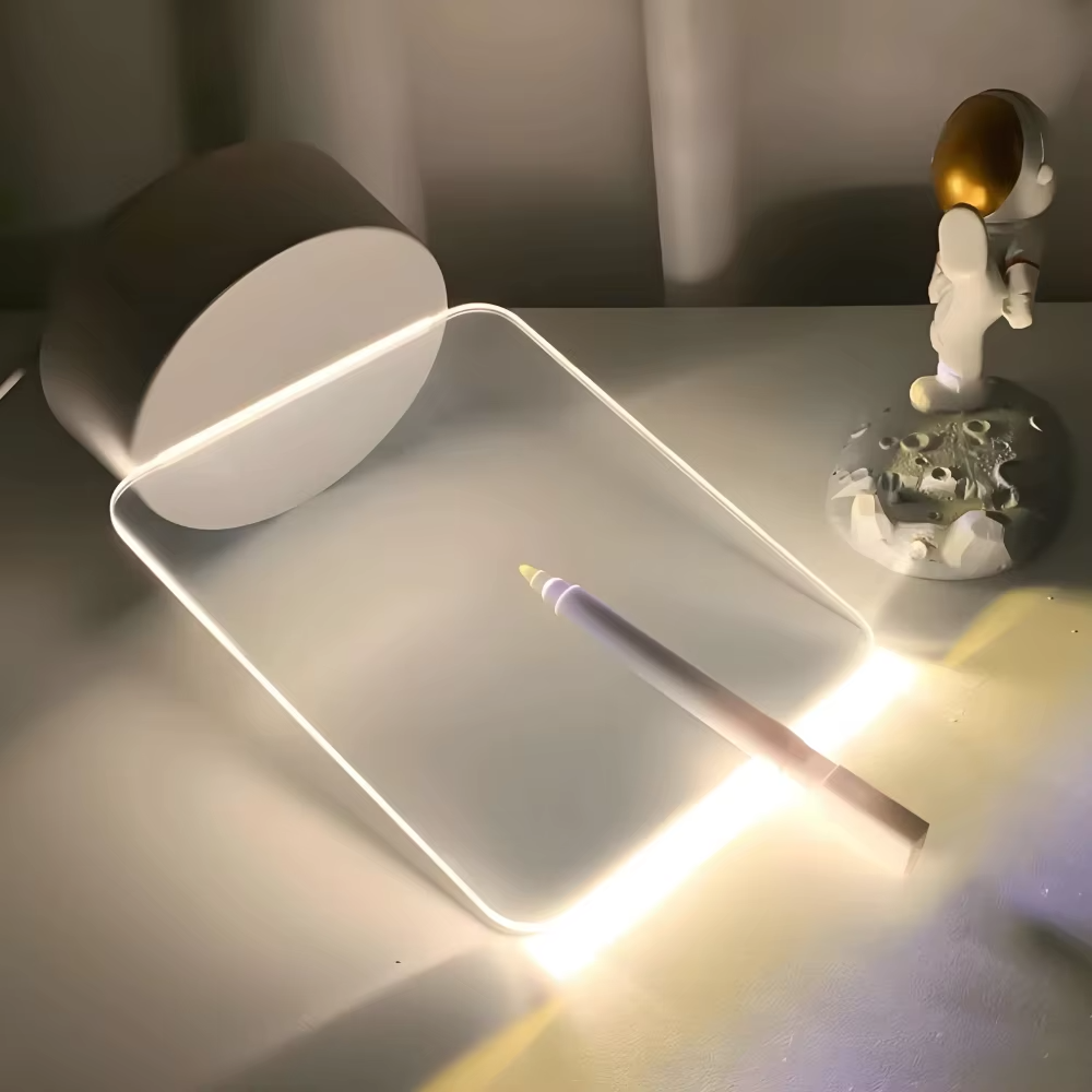 Com um efeito 3D de ilusão óptica, essa luminária cria a sensação de profundidade e forma graças à luz LED projetada sobre uma placa de acrílico. Além disso, acompanha caneta de giz líquido, para você personalizar mensagens, frases ou desenhos diretamente no acrílico, criando sua própria arte luminosa!