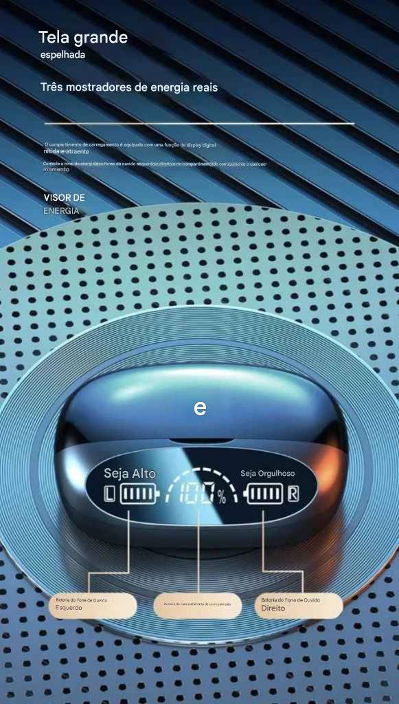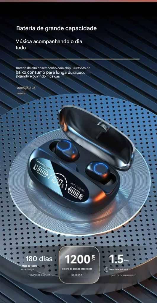 Acompanhe a carga dos fones e da case em tempo real com o display digital — moderno, prático e funcional.