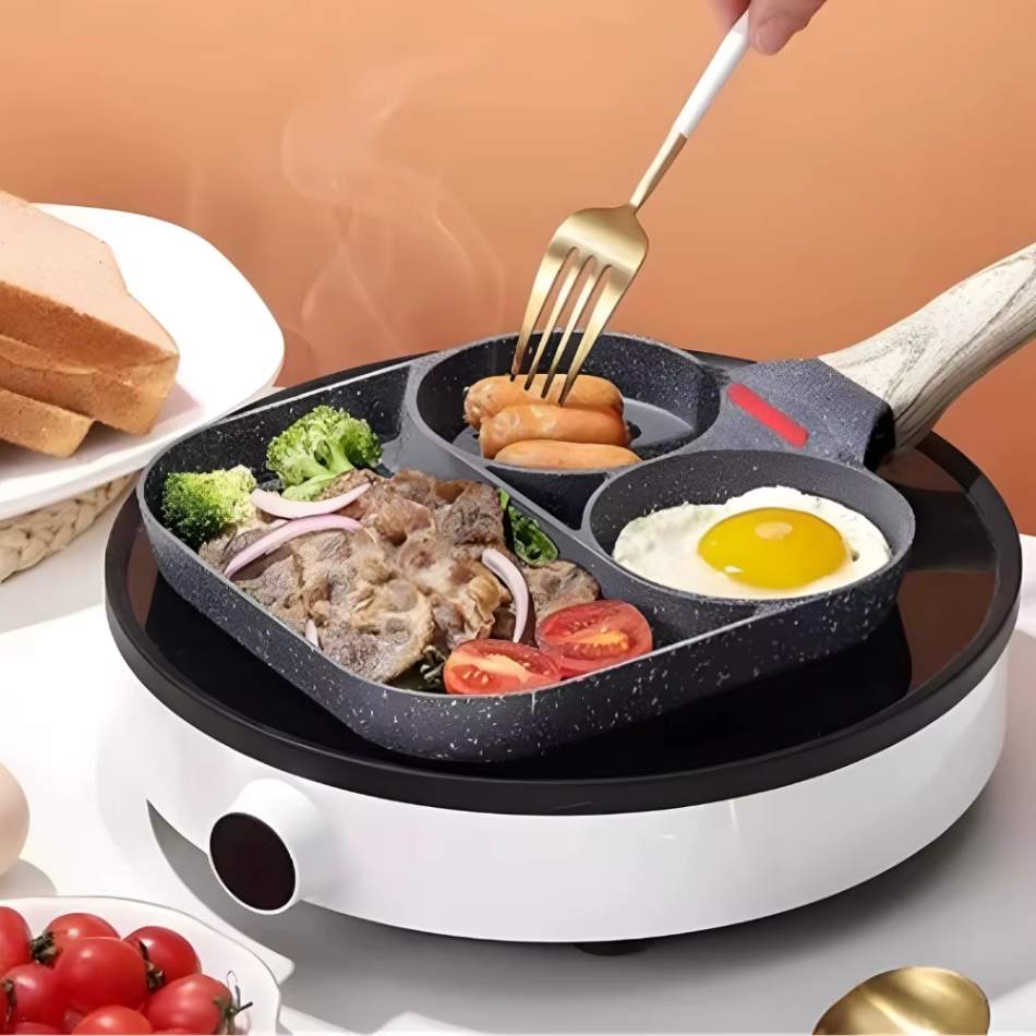 Descubra o prazer de cozinhar de forma prática, rápida e sem bagunça com a TrioSabor™, a frigideira antiaderente com 3 divisórias inteligentes, perfeita para preparar ovos, bacon, carnes, legumes e até lanches completos ao mesmo tempo — sem misturar os sabores!